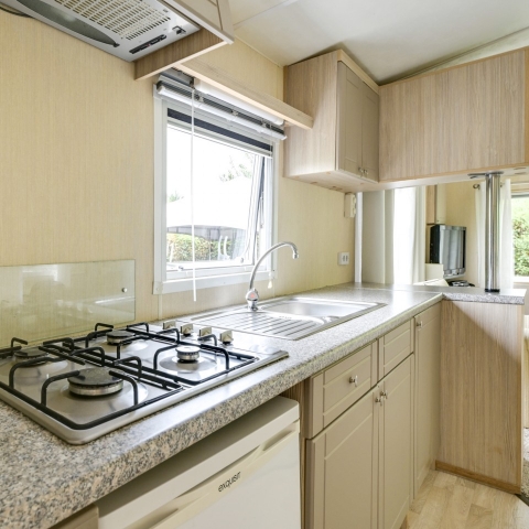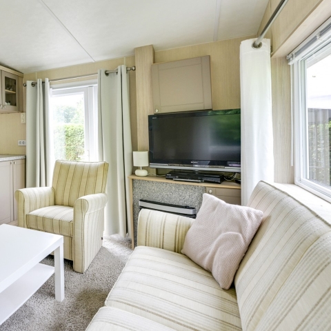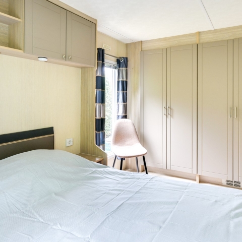 Het chalet beschikt over twee slaapkamers. Een kamer met een twee persoonsbed en veel kastruimte. En een slaapkamer met twee 1 persoonsbedden en kastruimte.